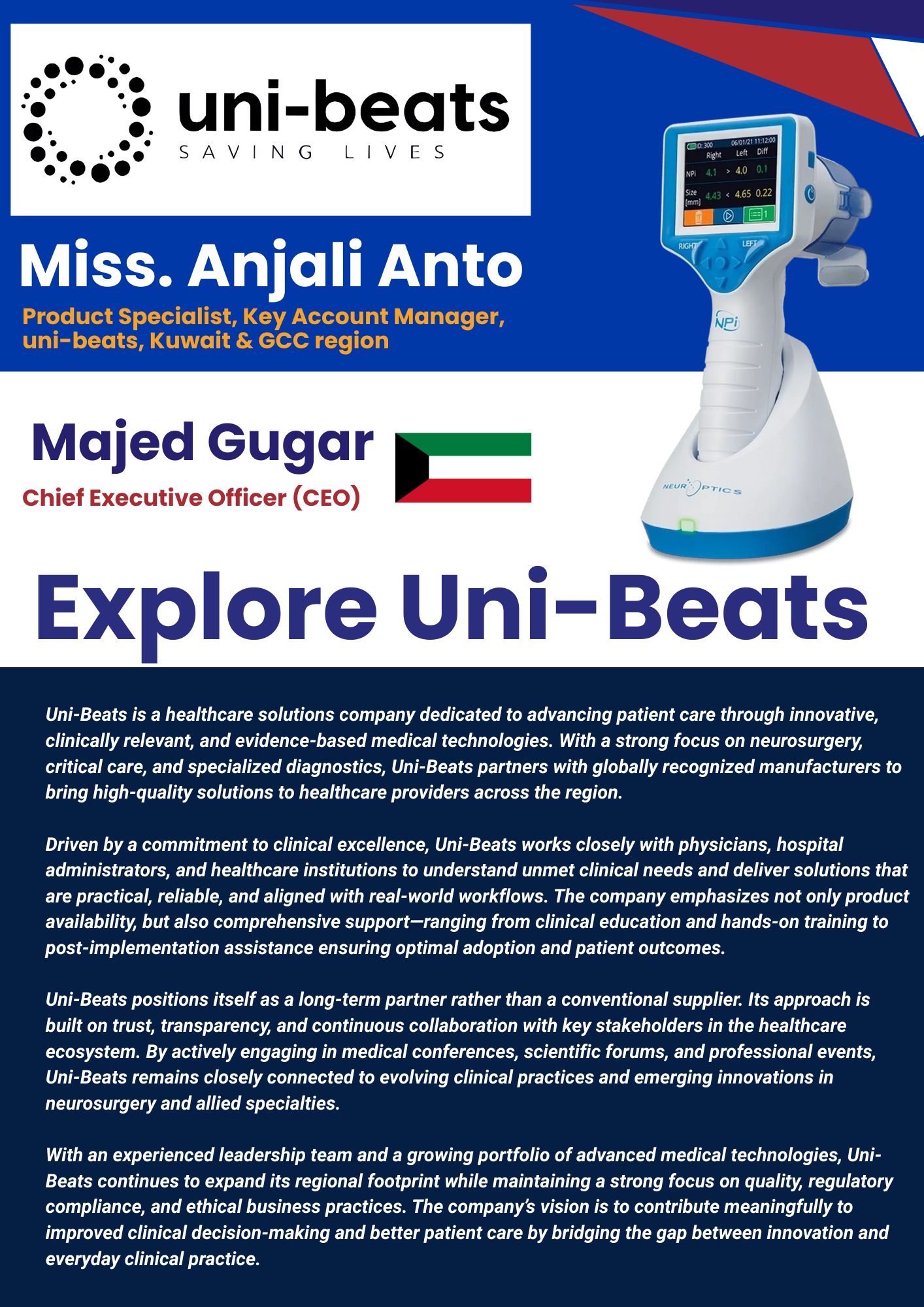 Uni-Beats is a healthcare solutions company committed to advancing patient care through innovative, clinically relevant, and evidence-based medical technologies. With a strong focus on neurosurgery, neuroscience, critical care, and specialized diagnostics, Uni-Beats collaborates with globally recognized manufacturers to deliver high-quality solutions to healthcare providers across the region.