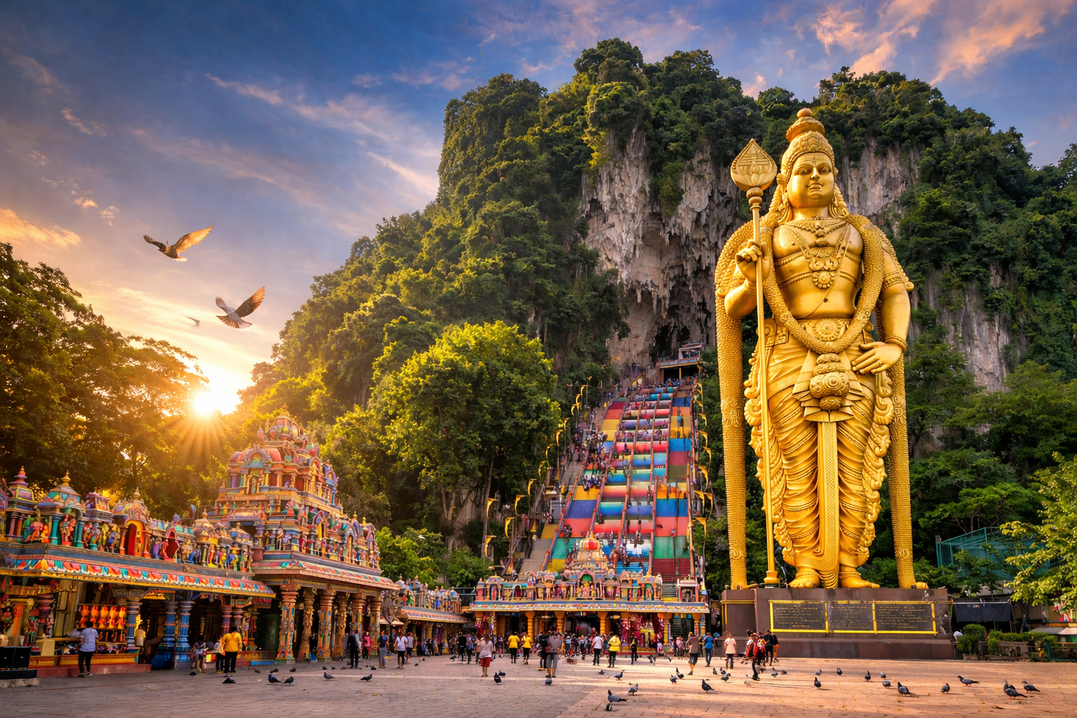 A famous Hindu shrine set within limestone caves, known for its massive golden statue of Lord Murugan and colorful staircase leading up to the cave temples.